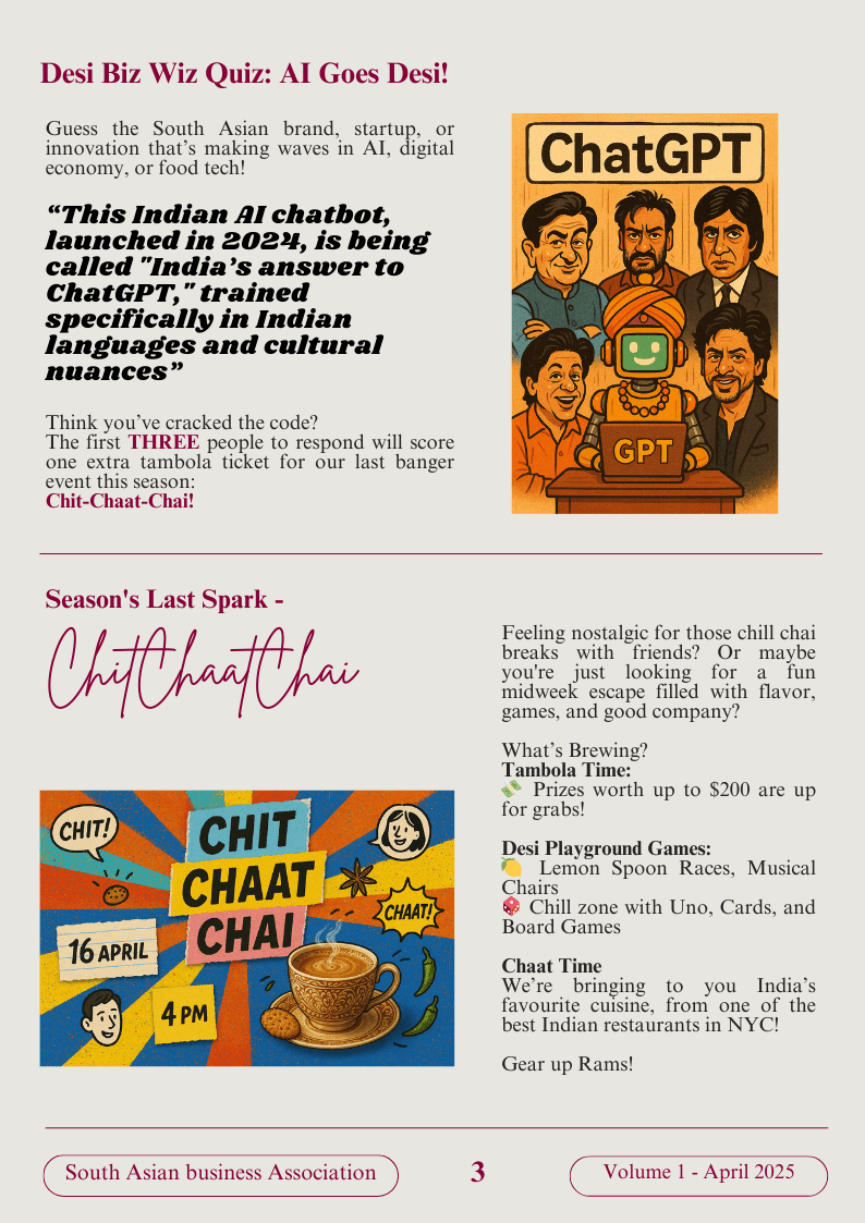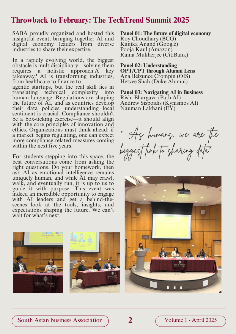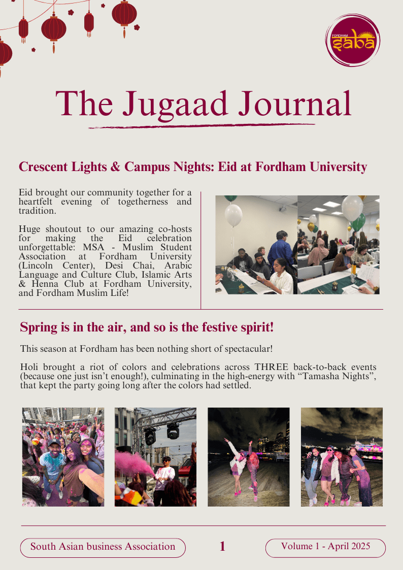 Started The Jugaad Journal, SABA’s first-ever newsletter at Fordham University, to spotlight community stories, career resources, and cultural celebrations. Also organized and hosted several business panels and cultural events aimed at fostering community, connection, and professional growth.